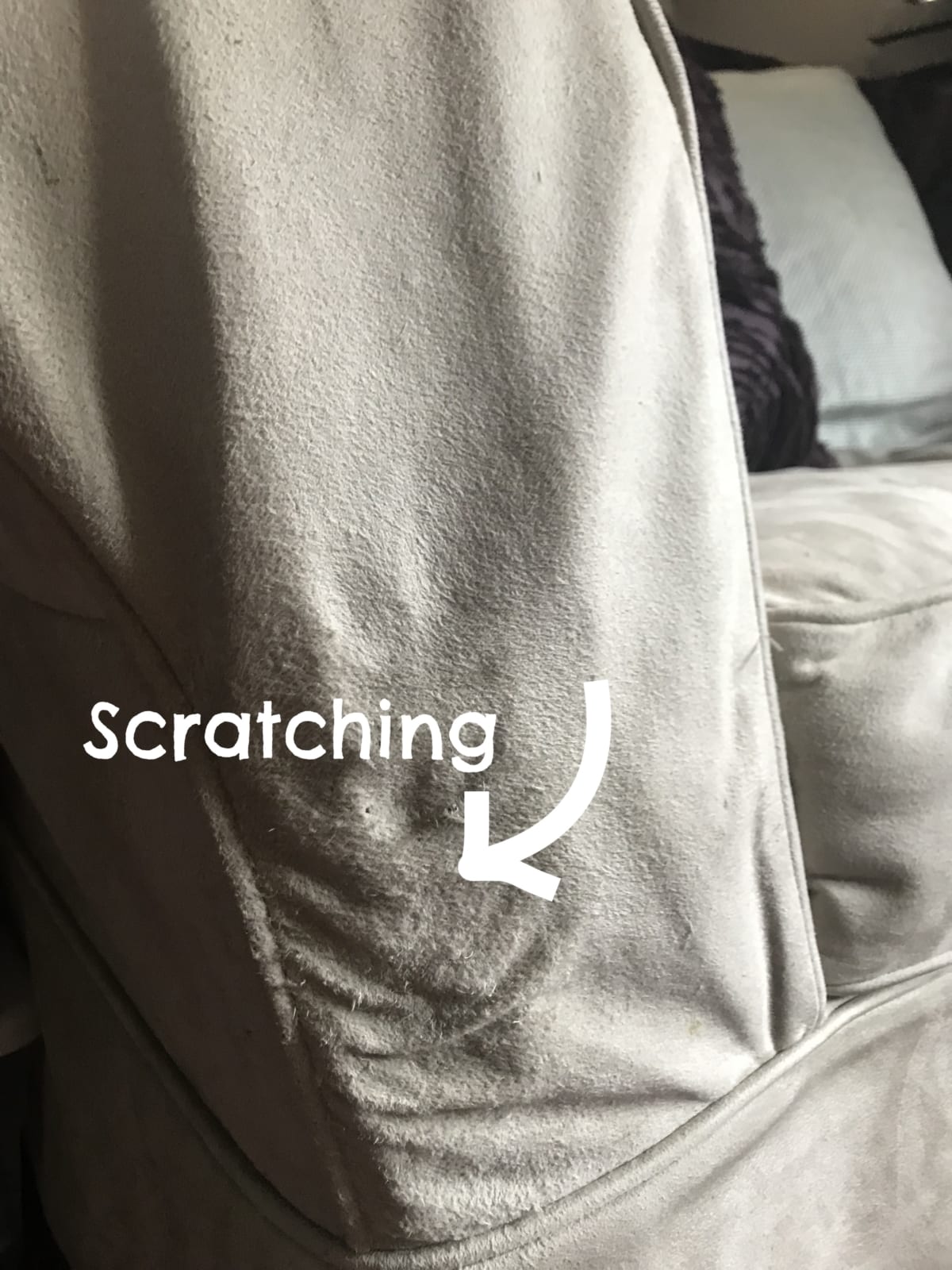 One of my foster cats, Maggie, is a stray – and we think she’s probably about 8-9 years old. I suspect she had never been introduced to an indoor scratching post. She likely used a tree outdoors as her scratching post. Upstairs, Maggie has taken a liking to a big, oversized chair that is upholstered in microfiber. Side note: Microfiber holds up remarkably well to scratching!