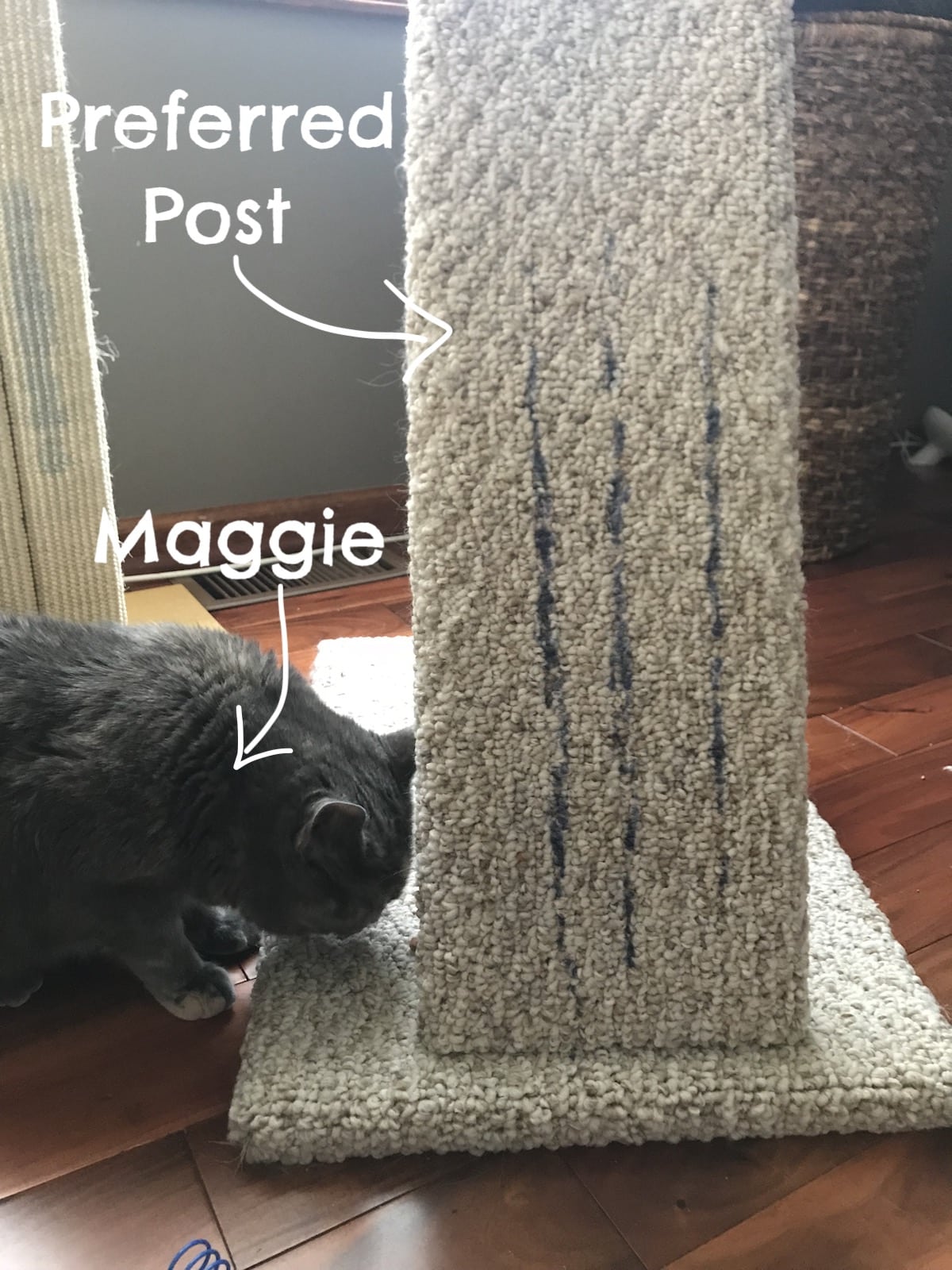 I’ll continue to monitor Maggie’s scratching and if she decides to go back to the couch, we may consider covering a scratching post with microfiber cloth so that she has a post with a substrate that she enjoys scratching. I will also add a few other carpeted scratching posts/pads, shelves, etc around my home so that she has a place that she finds enjoyable to scratch.