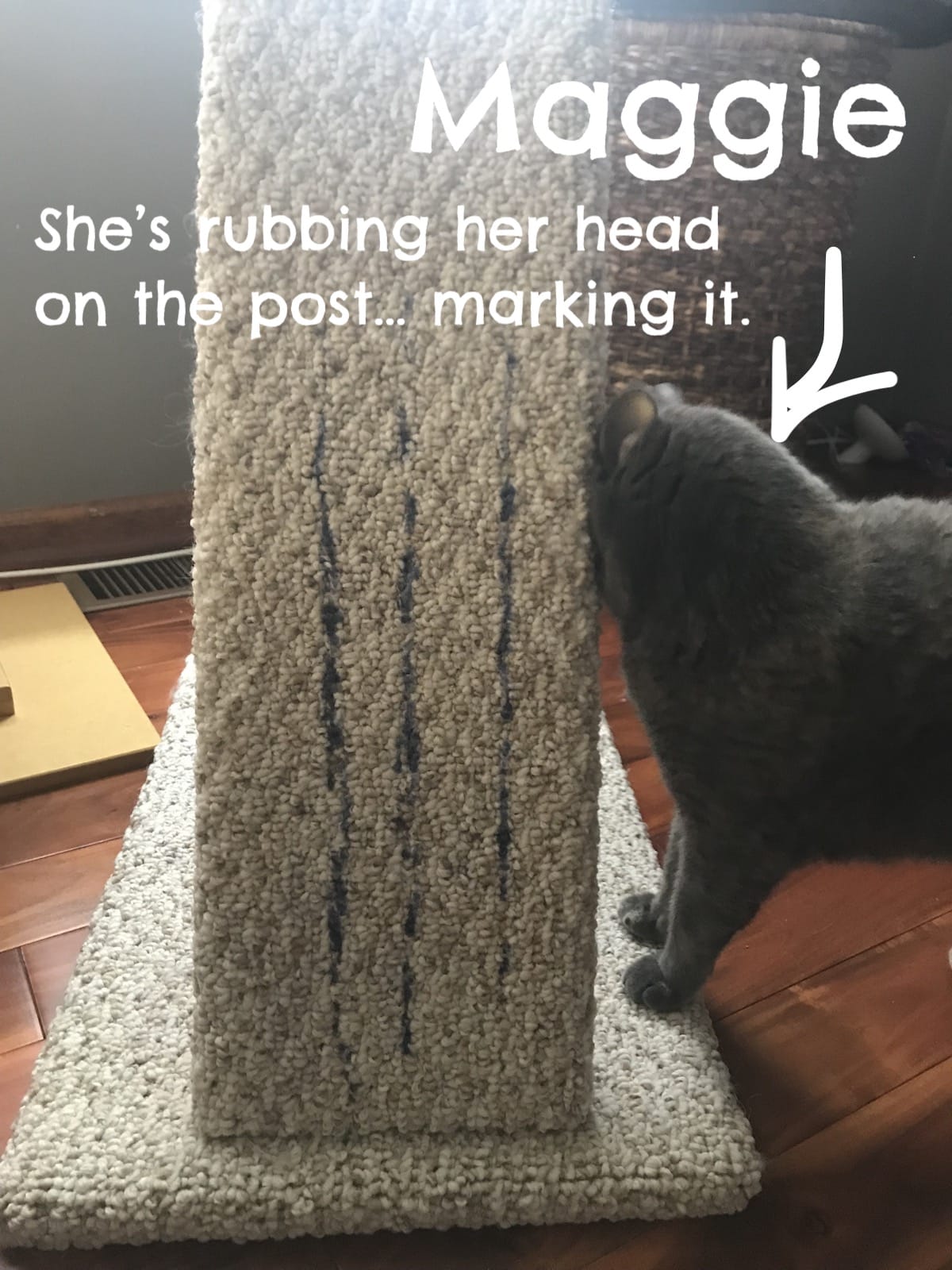 The FELISCRATCH is telling Maggie that the post is the place that she should scratch with both the visual marking of the blue dye and the smell of the catnip+pheromones in the FELISCRATCH formula.